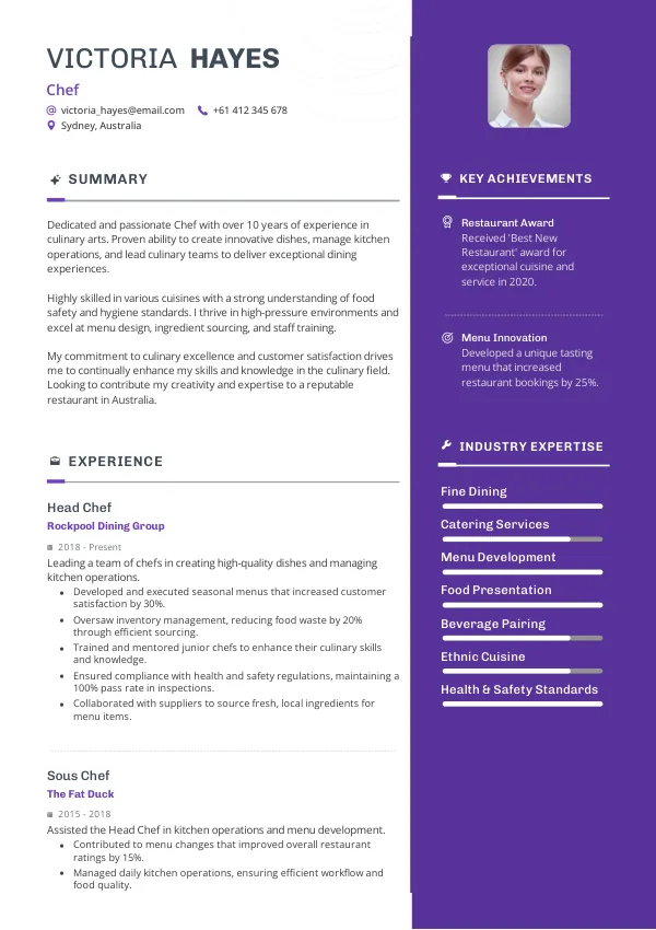 Focus on your culinary skills, relevant experience, achievements, and any certifications that make you a standout candidate in the Australian job market.