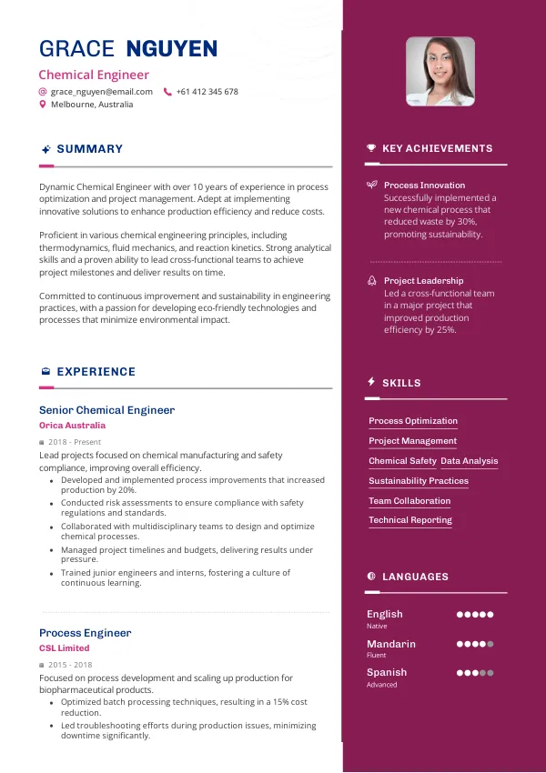 - Achievement: Improved chemical process efficiency by 20%, resulting in A$200,000 annual savings.