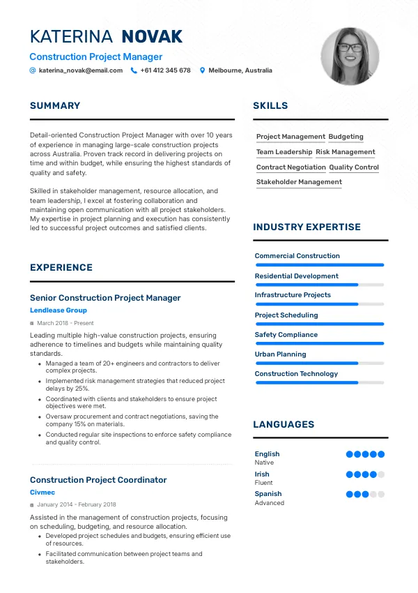 Don’t miss your chance to work in Australia as a Construction Project Manager. A professionally crafted resume can make all the difference.