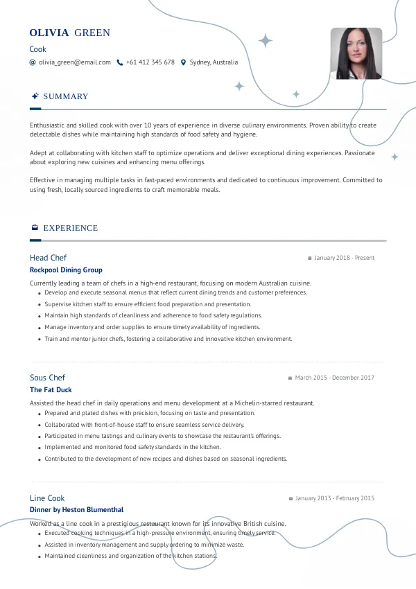 - Achievement: Developed a new seasonal menu that boosted restaurant sales by 15%.