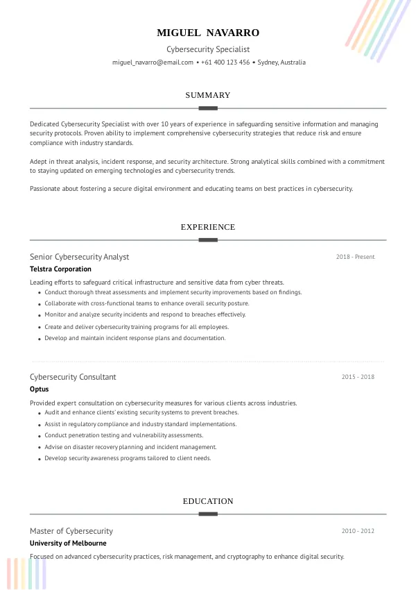 The job market for Cybersecurity Specialists in Australia is competitive and rapidly evolving. A tailored CV & Resume can make a significant difference in getting noticed by recruiters and hiring managers.