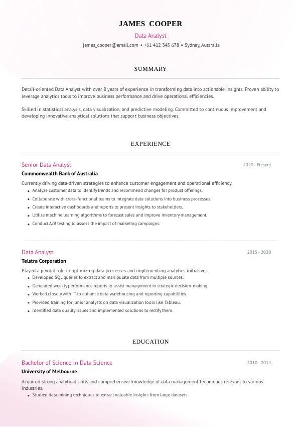 The demand for Data Analysts in Australia remains strong, especially in sectors like finance, healthcare, and technology. Salaries can vary significantly based on experience and location, with entry-level positions starting around AUD 70,000 and experienced analysts earning upwards of AUD 100,000 annually. While the job market is competitive, having a professionally crafted resume can significantly enhance your visibility to employers.