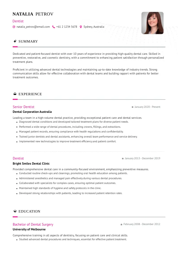 A results-focused Dentist resume that highlights your impact and passes ATS filters.