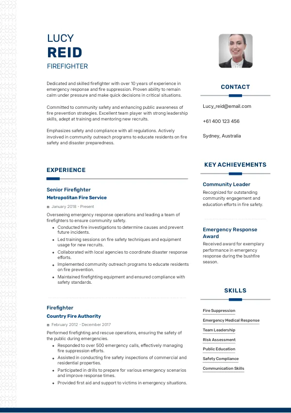 Are you a passionate firefighter looking to advance your career in Australia? Our professional resume service is designed to help you stand out in a competitive job market. We specialize in creating tailored CV & Resume solutions that showcase your unique skills and experiences.