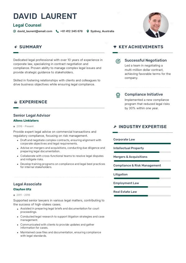 - Achievement: Successfully negotiated a settlement for a high-profile client, saving them A$1 million.
