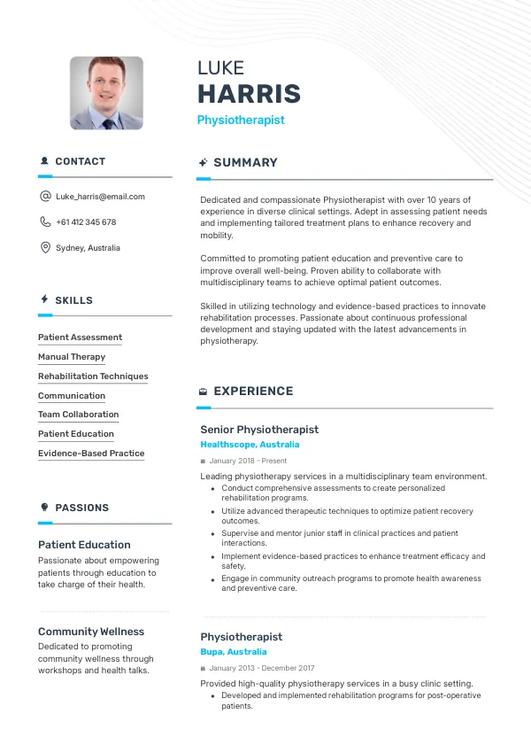 The demand for Physiotherapists in Australia is consistently high, driven by an aging population and a growing focus on preventative health. While salaries can vary based on experience and location, the average annual salary for Physiotherapists typically ranges from A$70,000 to A$90,000. This competitive market highlights the importance of a standout resume that effectively communicates your qualifications to potential employers.
