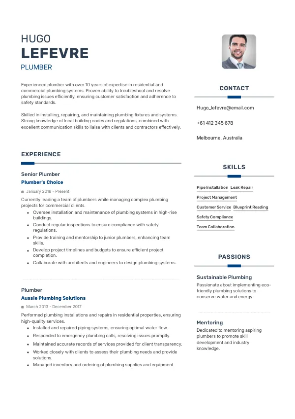- Achievement: Led a team of 5 plumbers on a major commercial project, completing ahead of schedule.