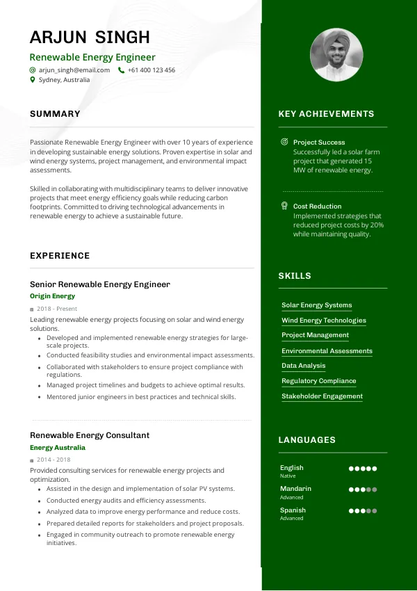 - Achievement: Led a team in the successful implementation of a solar energy project that reduced costs by 30%.
