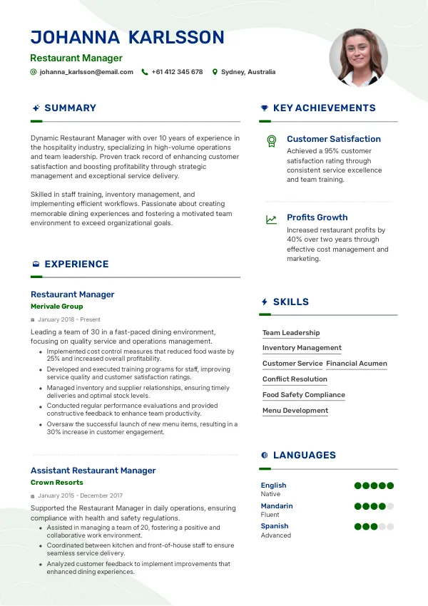 - Create your Truecv Restaurant Manager CV or resume to align with Australian standards.