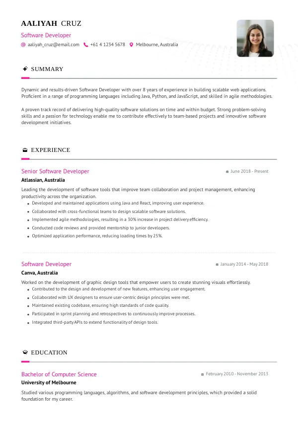 Don’t miss out on your dream Software Developer role in Australia. With Truecv's professional resume services, you can enhance your chances of success and get noticed by employers. Start your journey today for just A$9 and take the first step towards your new career!